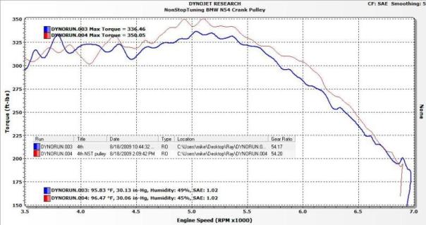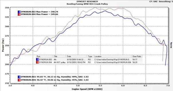 We visited our favorite dyno at CarboyRacing, in AUGUST 2009, for some dyno testing on our project BMW 335i. We ran a baseline dyno around 10AM and watched the twin turbo BMW 3.0 Liter N54 put down some impressive numbers. The guys at Carboy installed the new NST CR-Lite (OEM Diameter) Crank Pulley in a couple hours, and we put the car back on the dyno, after lunch, for a few more runs. Absolutely no other modifications were made to our project car on this day. The dyno calibration, weather conditions, etc. remained unchanged.