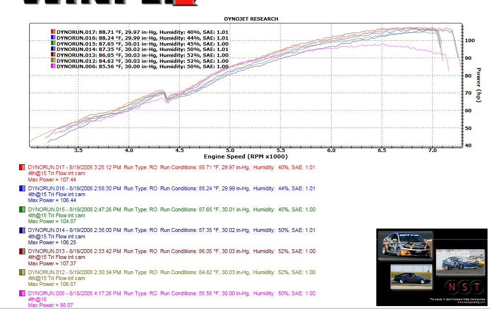 Proper dyno testing and dyno charts should show you dates, times of day when dyno runs were made, outside temperatue, humidity levels, max power, max torque, RPM, speed, and SAE numbers. As you can see, the NST charts clearly display all of this data.