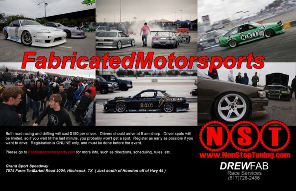 Posted on March 25, 2010, in Motorsports, NonStopTuning and tagged Fabricated Motorsports, GSS Drift Day, Houston Drifting, NonStopTuning, NST Drift Team. Bookmark the permalink. Comments Off on FabricatedMotorsports Drift Event, Sun March 28, 2010.