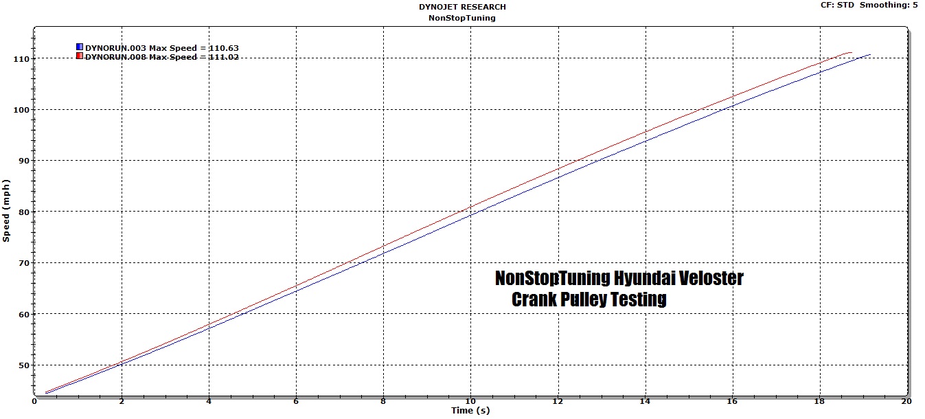 Looking at the graph plotted for Speed vs Time, we see that 110mph was reached faster with the NST CR-Lite Pulley. The Veloster’s acceleration seems to have improved by about 1 second in this test.