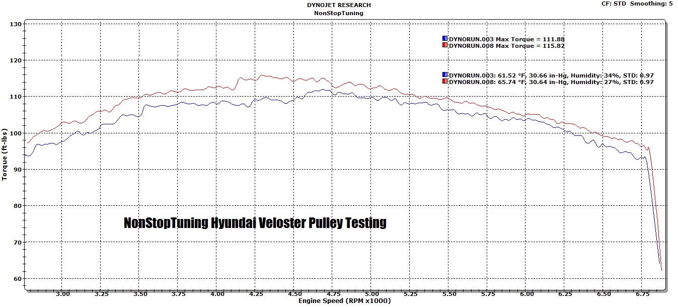 Conclusion? NST Pulleys improve power, torque, and response across the entire power band. Looking at the area under the power and torque curves you will notice positive gains in the low, mid, and high range when the NST Crank Pulley is used. No other modification in the same price range can offer similar gains across the entire power band. This fact makes the NST Pulley one of the best bang per buck performance modifications for the Hyundai Veloster.
