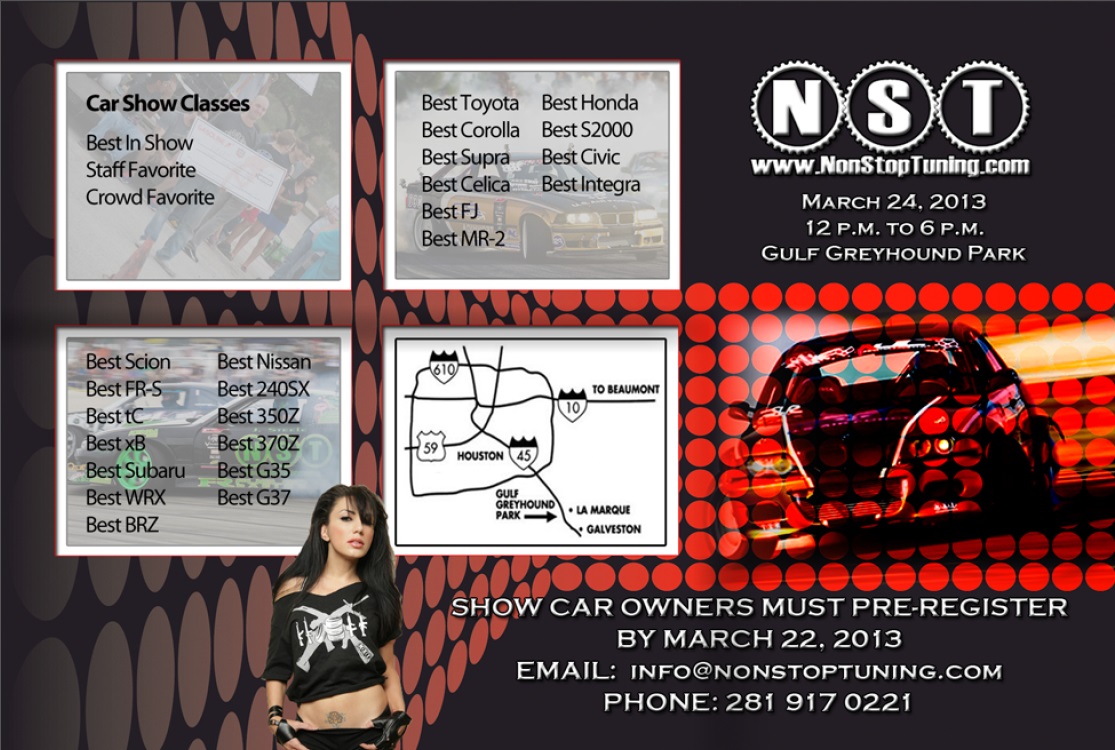 NonStopTuning would like to invite all our friends and fans to join us for the NST 10th Anniversary Car Show, March 28/29, 2015. Bring your friends and family for two days of Lone Star Drift action, an NST Car Show with over 60 classes on Sunday, and a huge party Saturday night!
